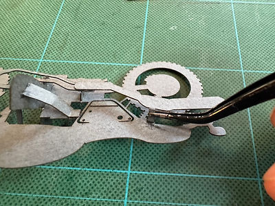 ボディのエンジンとサイドカバーの間の長方形の細い穴にマフラー(エキパイ)ステーをピンセットを使って写真の向きのように入れ込みます。