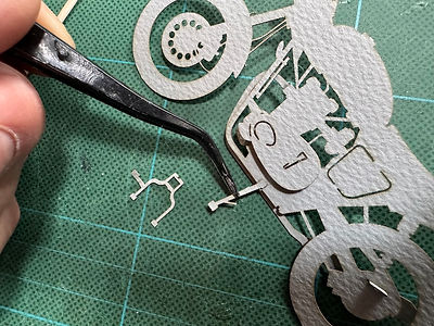 センタースタンドの脇には、足を乗せるレバーが付いています。このレバーが左側に来るように持って、ピンセットで挟んで上に方面に曲げていきます。