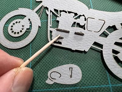 パーツを折り曲げる時には、折り曲げる方向と逆面に定規などあてて、ナイフでスジを入れます。が、あまり強く押しつけると紙が切れてしまいますので、軽く線をひく!感じです。